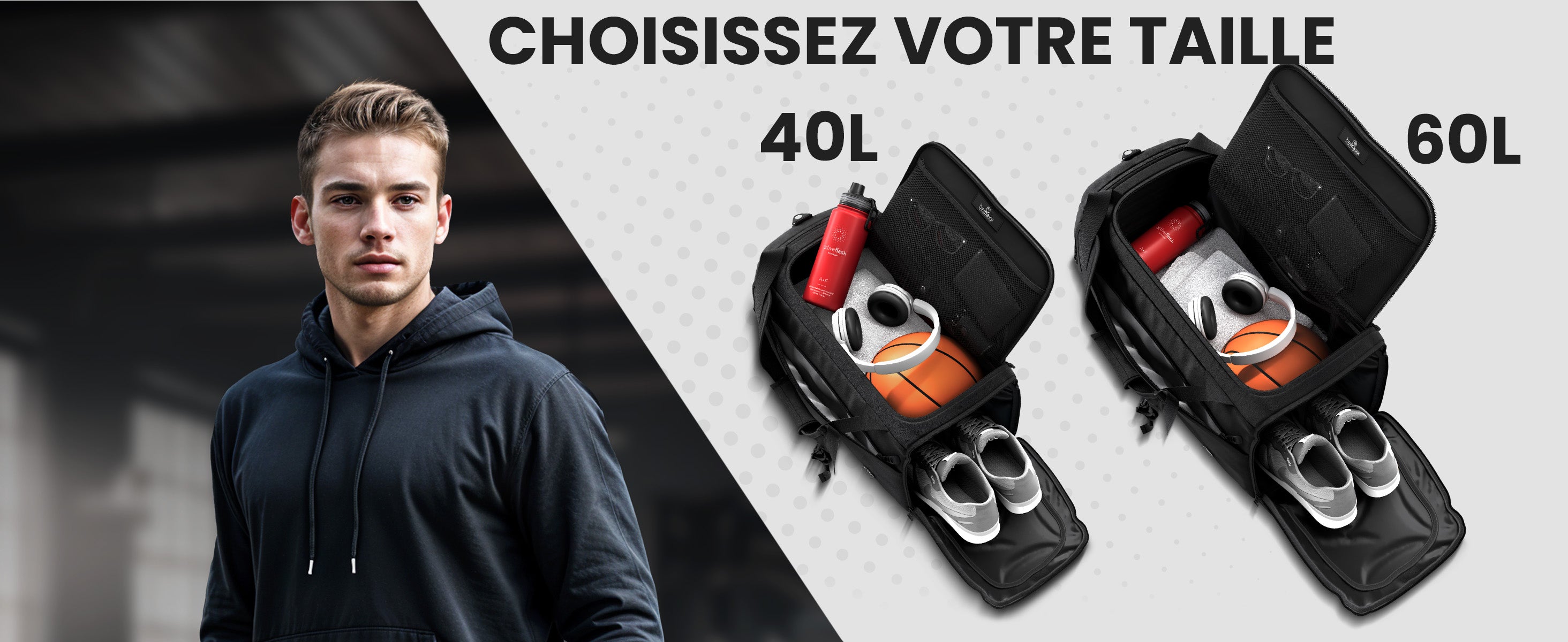 🎒 TOUT EST À PORTÉE DE MAIN ET ORGANISÉ ! PLUS BESOIN DE FUMER DANS VOTRE SAC : Avec son grand compartiment principal, ses deux poches latérales et sa poche filet, vous disposerez de suffisamment d'espace pour ranger en toute sécurité et organiser soigneusement tous vos équipements de sport et objets de valeur. Grâce à une séparation judicieuse des compartiments, vos objets de valeur et vos vêtements sont toujours séparés de vos chaussures de sport et du compartiment pour objets mouillés.